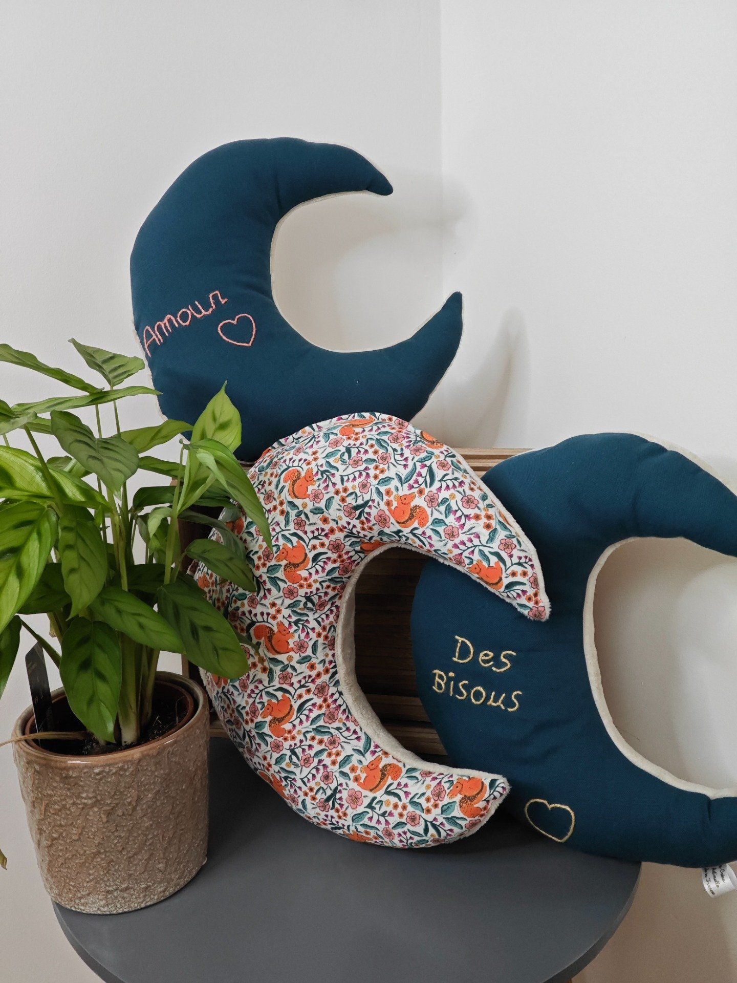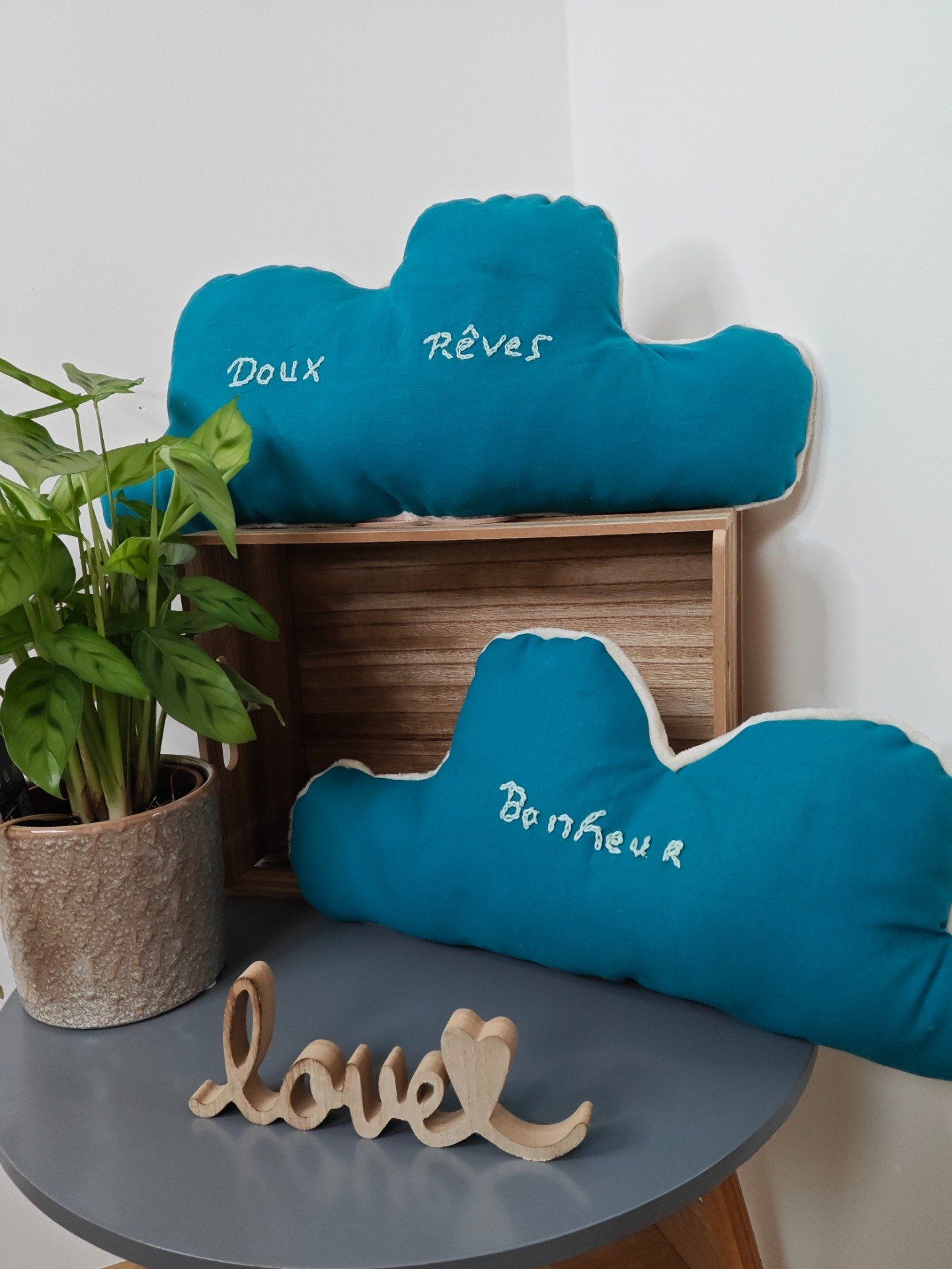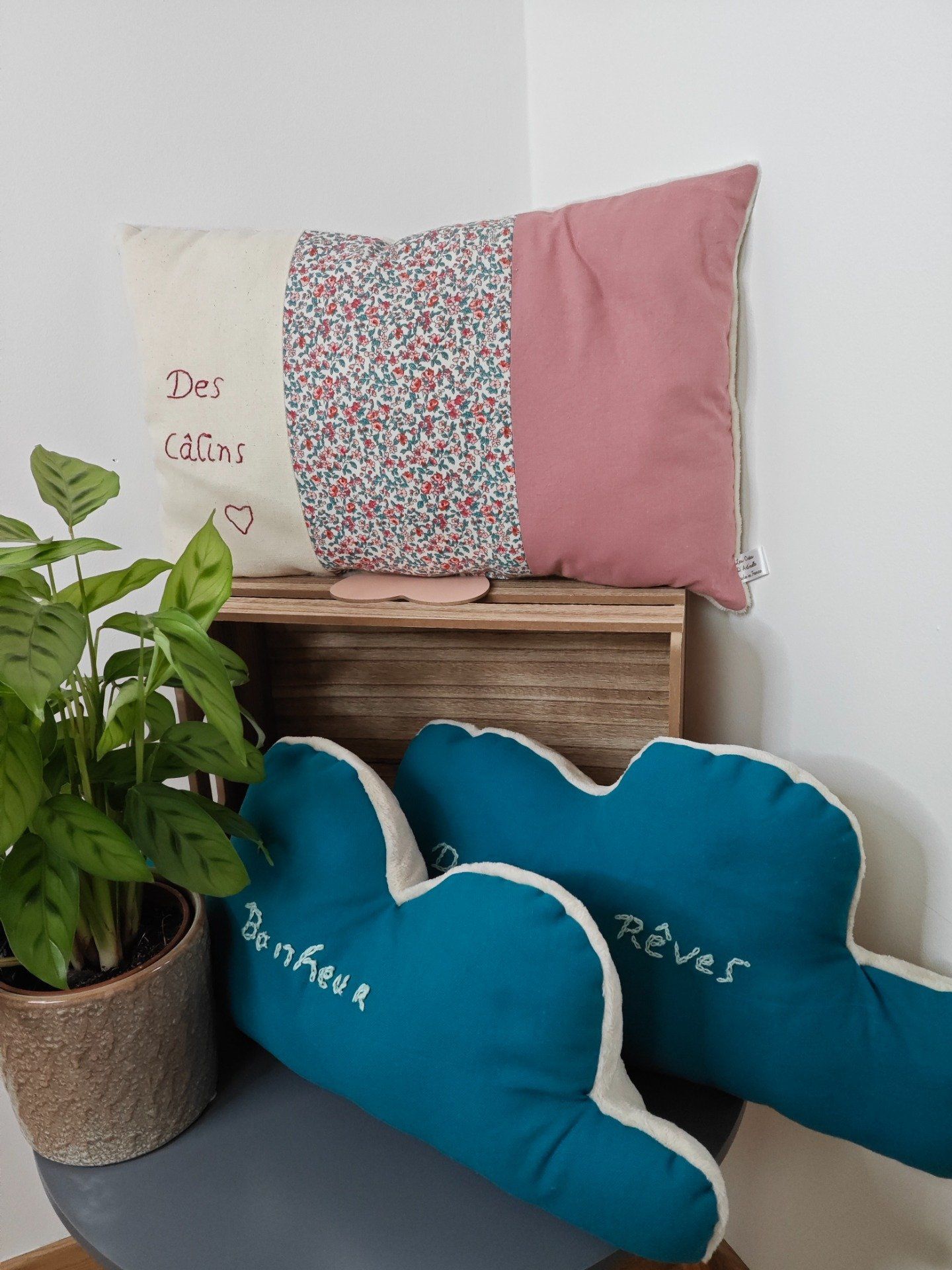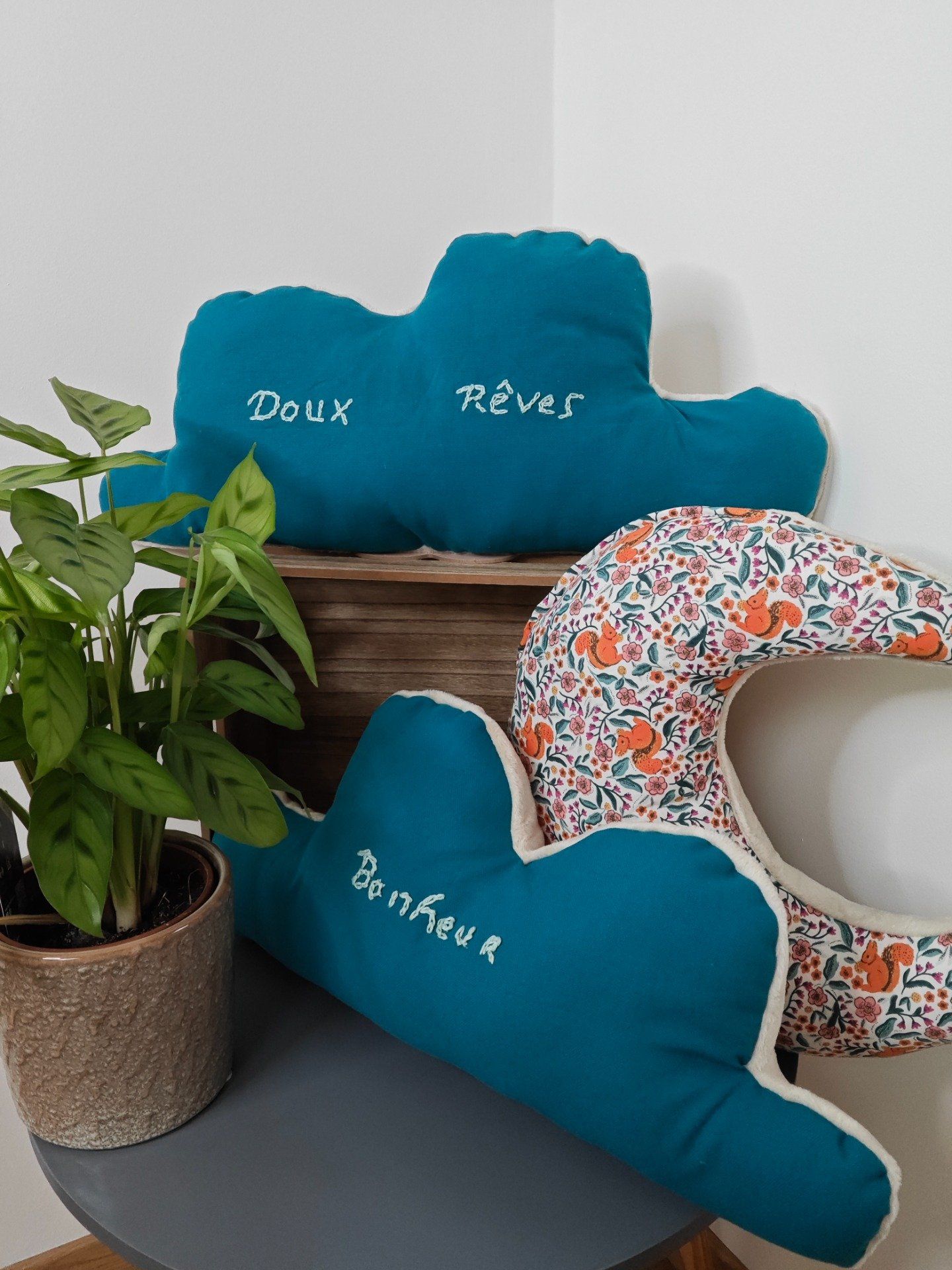 Un peu de douceur avec les coussins nuages, lune et rectangulaire avec broderie messages. Les coussins parfait pour créer une ambiance cosy.