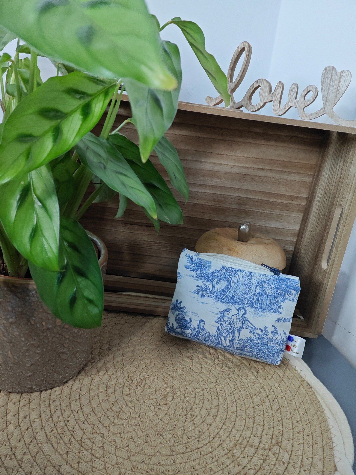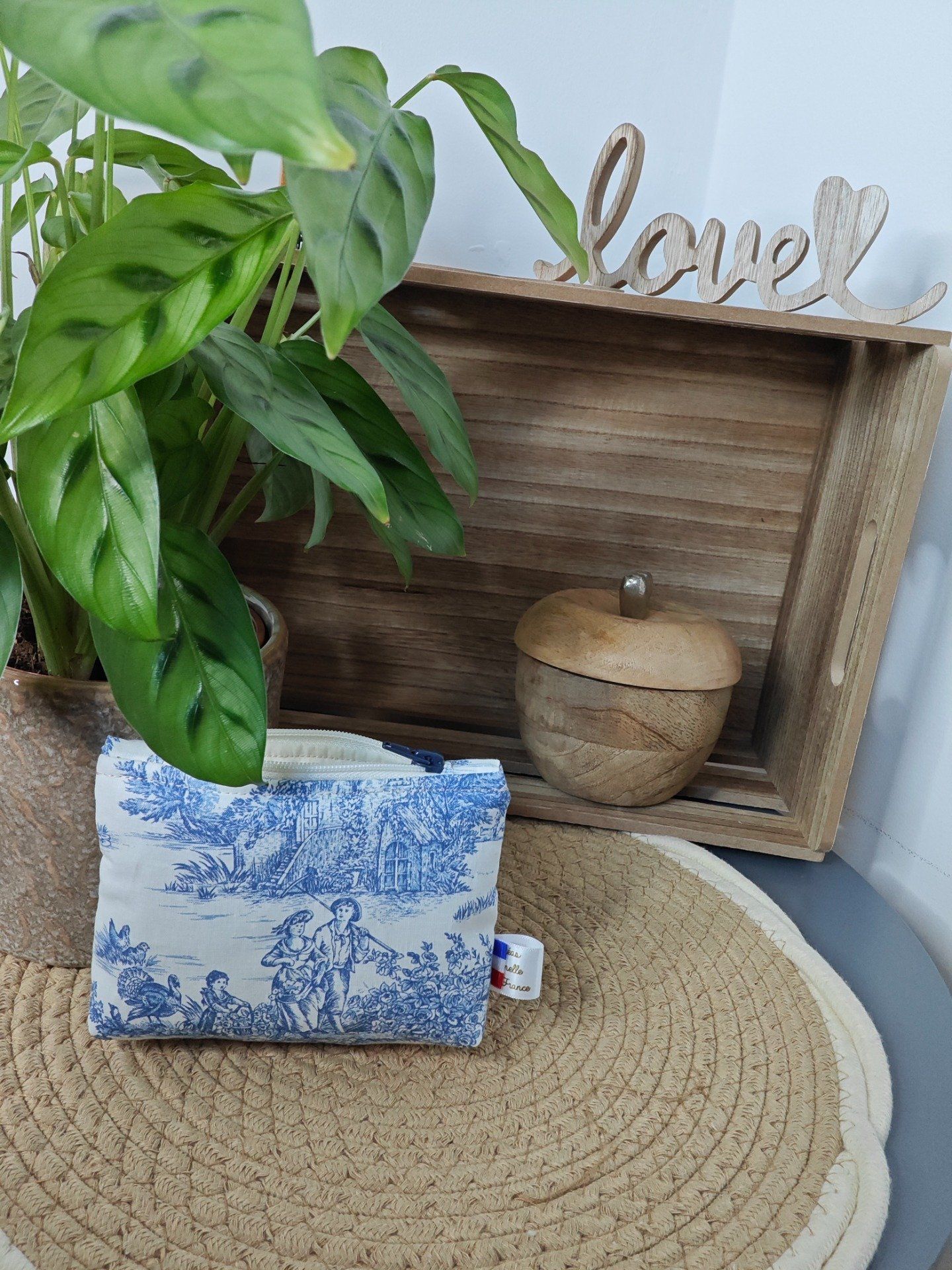 Composition : tissu extérieur toile de Jouy, intérieur tissu polyester beige, molletonné de ouate.